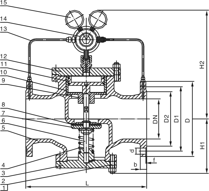 本系列減壓閥屬于先導(dǎo)活塞式減壓閥。由主閥和導(dǎo)閥兩部分組成。主閥主要由閥座主閥盤、活塞、缸套、彈簧等零件組成。導(dǎo)閥主要由閥座、閥瓣、膜片、彈簧、調(diào)節(jié)彈簧等零件組成。通過調(diào)節(jié)調(diào)節(jié)彈簧壓力設(shè)定出口壓力,利用膜片傳感出口壓力變化,通過導(dǎo)閥啟閉驅(qū)動(dòng)活塞調(diào)節(jié)主閥節(jié)流部位過流面積的大小,實(shí)現(xiàn)減壓穩(wěn)壓功能。