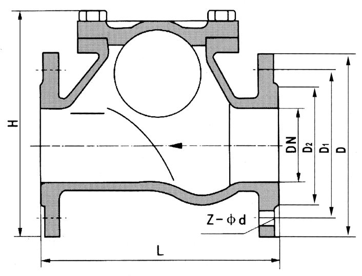 滑道滾球式止回閥,采用橡膠包皮滾球?yàn)殚y瓣,在介質(zhì)的作用下,可在閥體內(nèi)的整體式滑道上作上下滾動(dòng),從而打開(kāi)或關(guān)閉閥門,密封